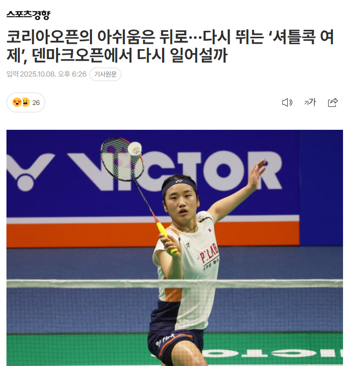 北京时间10月8日,韩国媒体《体育倾向》预热了世界第一安洗莹的丹麦公开赛,标题《羽毛球女帝在韩国公开赛折戟后能在丹麦公开赛站起来吗?》